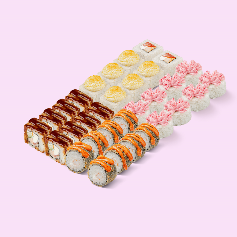 Рвётся к тебе в гости — приглашай. Состав: Эби темпура, Запечённый с курицей, Бекон унаги, Краб с огурцом